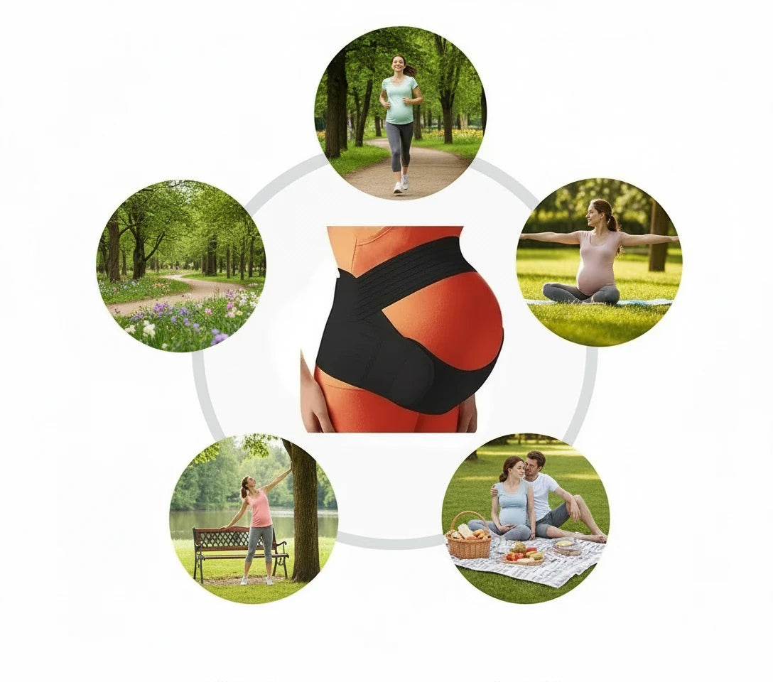 Cette ceinture agit comme un protecteur pendant la grossesse, disponible en plusieurs teintes élégantes : noir, nude, et blanc.
