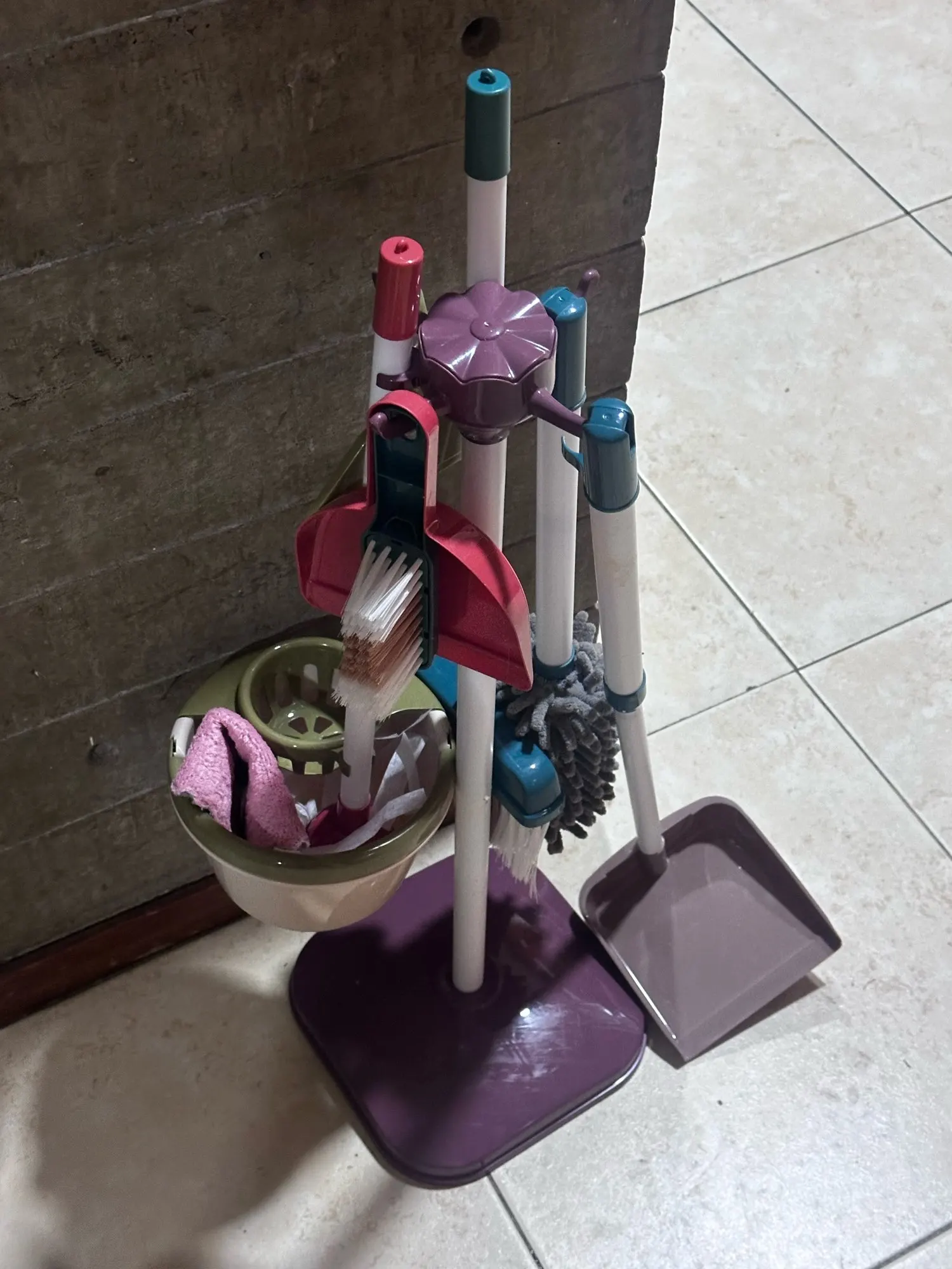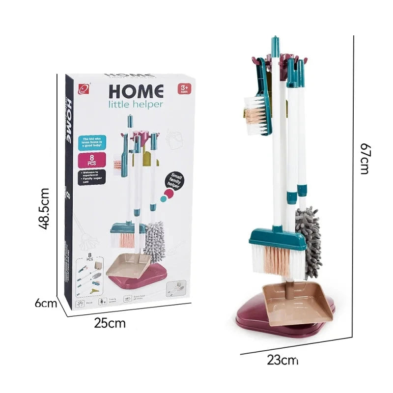 Conçu pour les petits de 3 à 6 ans, il comprend un balai, une serpillère, un aspirateur jouet, un seau et des accessoires de dépoussiérage.