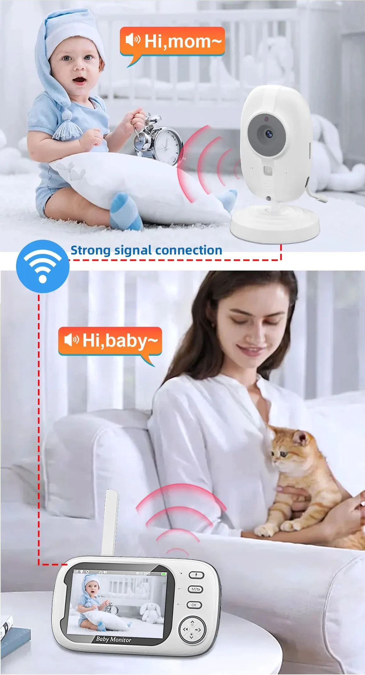 Ce moniteur vidéo sans fil intègre de nombreuses fonctionnalités avancées : prise en charge de plusieurs récepteurs, interphone bidirectionnel, alarme détectant les pleurs du bébé, rappel des heures de repas, surveillance précise de la température, écran LCD clair, mode économie d’énergie, design portable et lecture musicale intégrée.